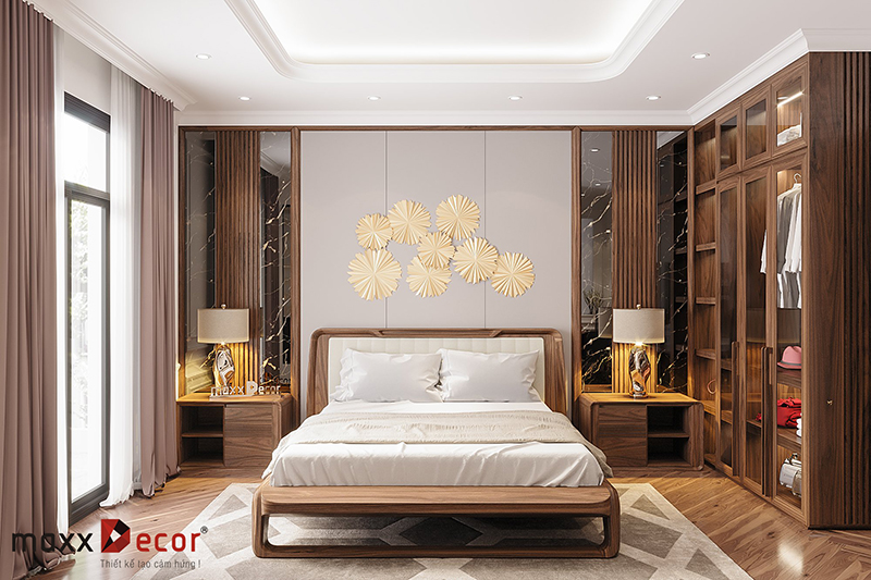 Màu nâu đậm chính là đặc điểm giúp dễ dàng phân biệt gỗ óc chó với các loại gỗ khác. Đây cũng chính là gam màu đang được bán rất chạy trên thị trường các nước trong đó có Việt Nam. Màu nâu đậm là gam màu tối nhưng nó lại toát lên vẻ đẹp của sự sang trọng, cổ điển, góp phần làm nổi bật thiết kế. Bên cạnh đó nó cũng giúp che đi những vết bẩn, vết xước,….Những đường vân gỗ uyển chuyển được chúng tôi tận dụng làm họa tiết trang trí, tạo điểm nhấn khi nhìn. Để phòng ngủ có sự tông suyệt tông về màu sắc thì bạn có thể sử dụng thêm tủ quần áo, bàn trang điểm cùng loại. Tuy nhiên không nên quá lạm dụng vì cả một không gian tối sẽ khiến phòng ngủ trông chật hẹp hơn, gò bó và bí bách,..
