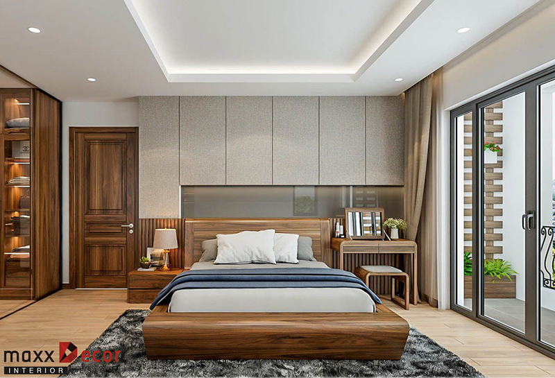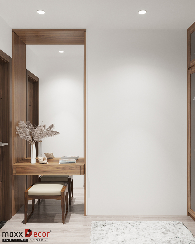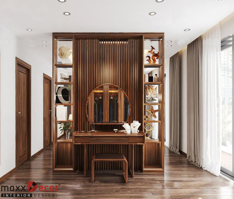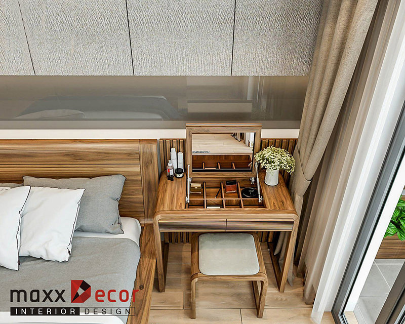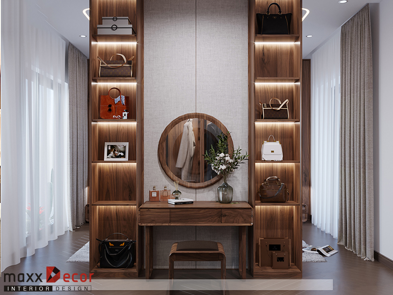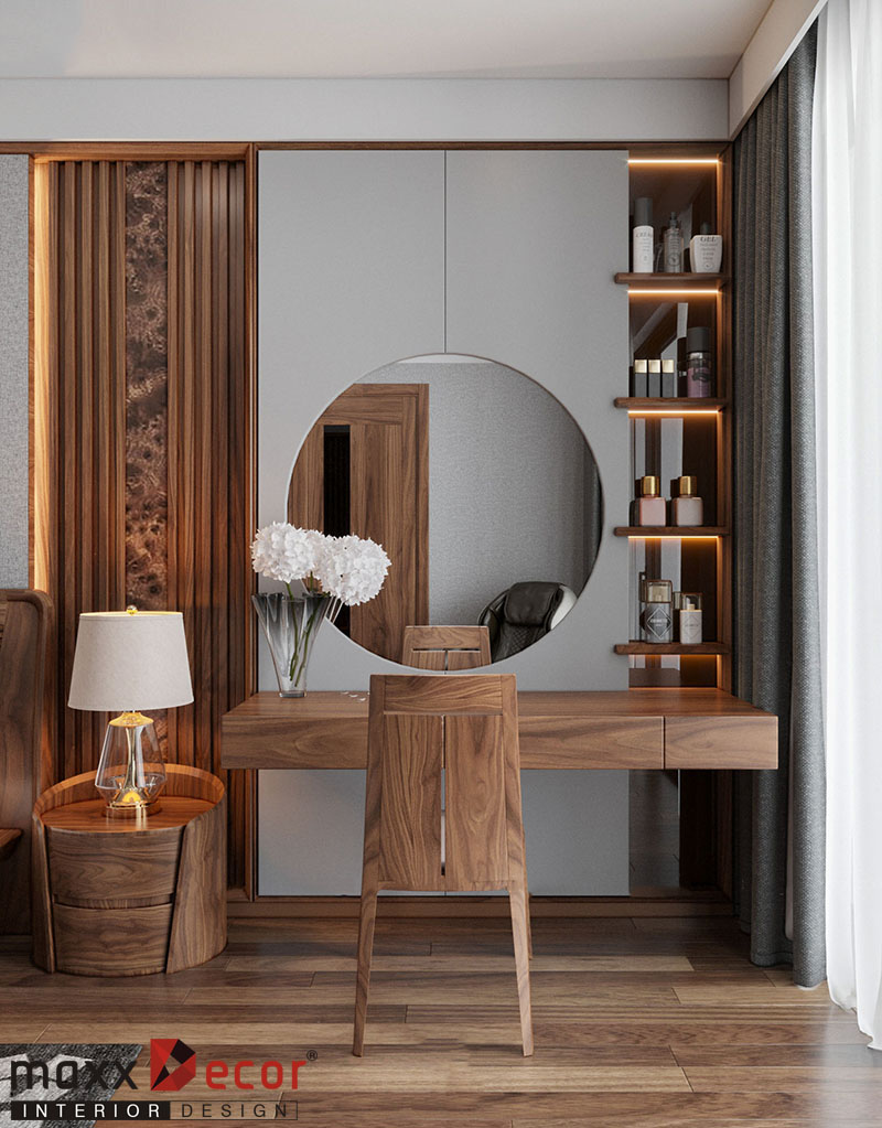Đối với phòng ngủ master bàn trang điểm thường được đặt trong một hệ tủ đồ để phụ kiện vừa là vách ngăn giữa không gian ngủ và không gian thay thủ đồ