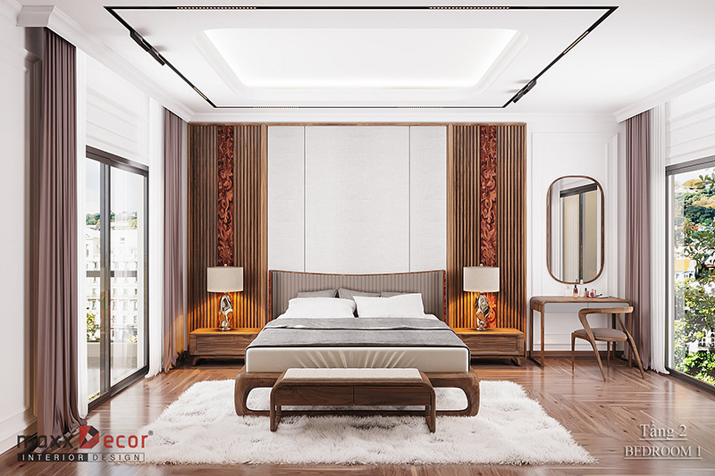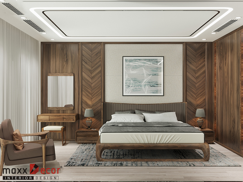 Tổng thể không gian nội thất phòng ngủ gỗ óc chó được đặt bàn trang điểm phía đầu giường. Bộ bàn ghế trang điểm thiết kế uống lượn độc đáo nhưng vẫn đảm bảo độ bền lâu của đồ nội thất bởi gỗ óc chó là một trong những loại gỗ được coi là loại gỗ có sức bền đẹp từ tự nhiên tạo ra những sản phẩm nội thất đẹp và bắt mắt nhất