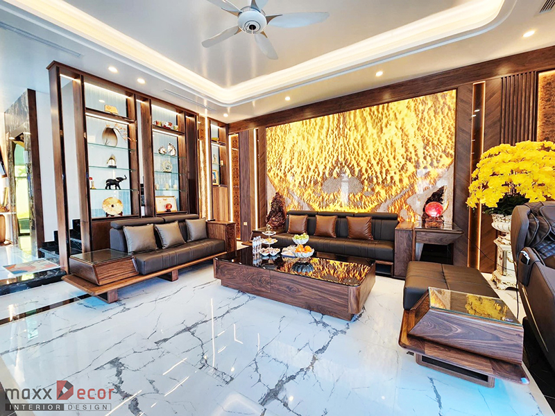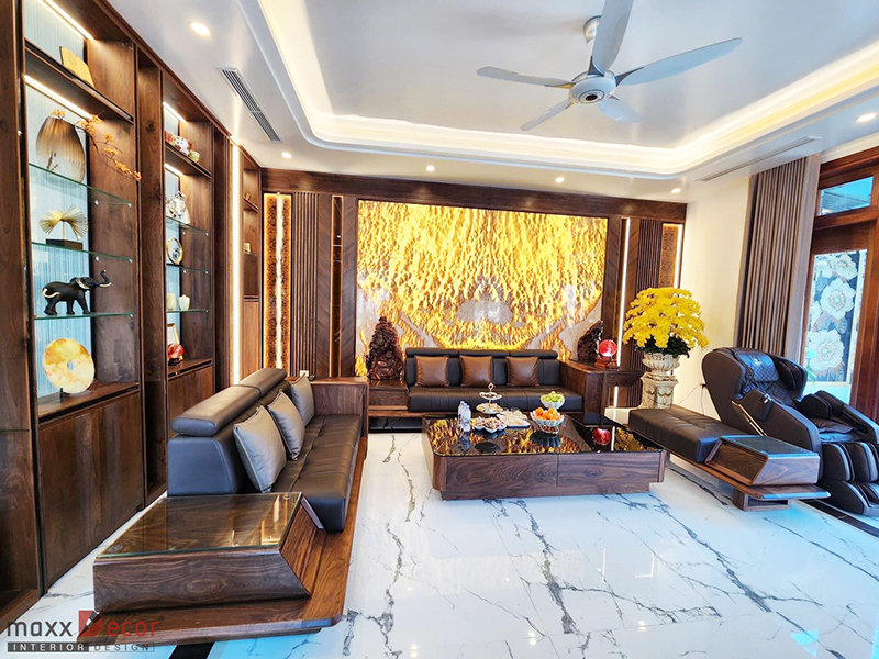 Phòng khách sử dụng toàn bộ gỗ óc chó từ sofa, tủ kệ đểu được sử dụng dòng gỗ này với thiết kế hiện đại kết hợp với đệm bọc da khiến không gian trở nên đẳng cấp. Ban đầu chủ đầu tư sợ dùng nhiều gỗ nhà sẽ tối và không hiện đại, nhưng sau khi được tư vấn và lên thiết kế gia đình rất ưng ý.