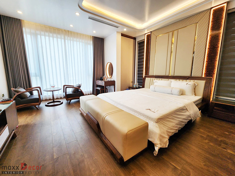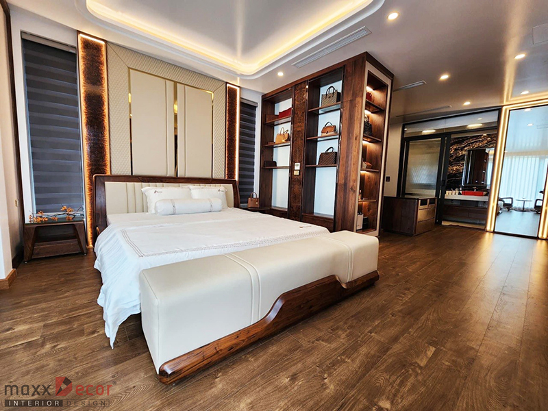 Phòng ngủ master hiện đại tiện nghi với chiếc giường ngủ gỗ óc chó cùng với kệ được bọc đệm da