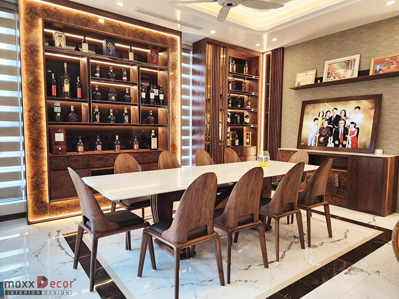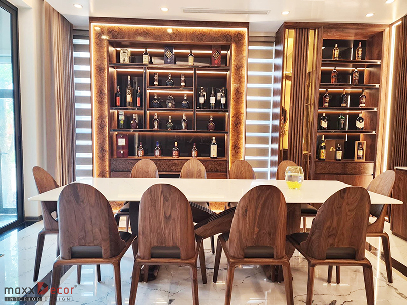 Bộ bàn ghế ăn gỗ óc chó 10 ghế khá rộng rãi cho cả gia đình dùng tiệc, bên cạnh là hệ tủ rượu đồ sộ ấn tượng