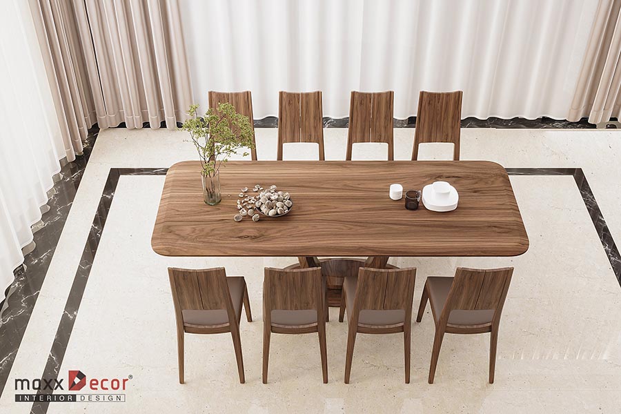 Với góc view từ trên xuống bộ bàn ăn gọn gàng thanh thoát đủ để gia đình đông người ăn nhưng lại không chiếm quá nhiều diện tích cho không gian này. Yêu thích mẫu bàn ăn gỗ tự nhiên hãy liên hệ với nội thất maxxDecor để được giá ưu đãi hoặc qua showroom để được tận mắt cảm nhận vẻ đẹp tuyệt vời của mẫu bàn ăn này nhé!