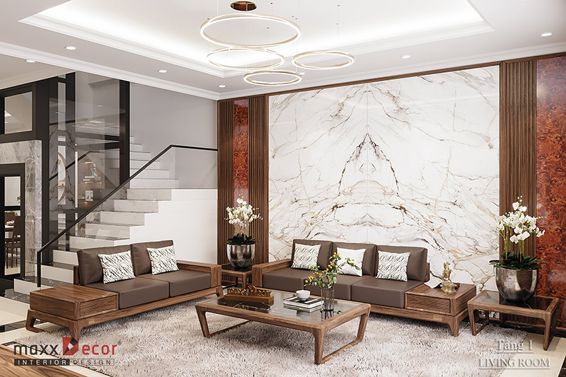 Là một gia chủ có niềm đam mê với gỗ, có lẽ đây là ý tưởng tuyệt vời với vách ốp tưởng gỗ và bộ ghế sofa - bàn trà được trau chuốt từ gỗ tự nhiên sang trọng.