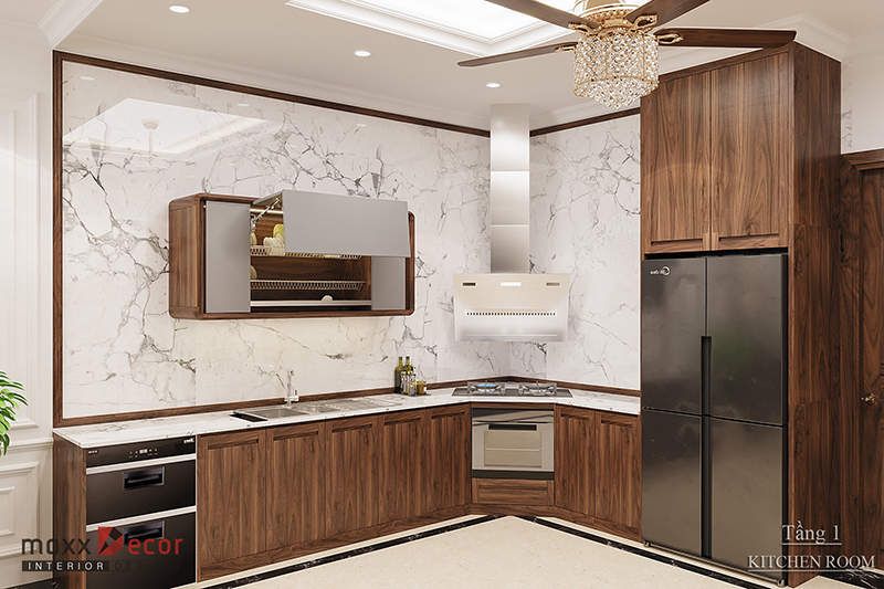 Màu nâu cánh dán của tone gỗ này luôn mang một nét đẹp trường tồn với thời gian, không bị lỗi thời. Hơn thế nữa, để có thể sử dụng hết vẻ đẹp của loại gỗ này, kiểu dáng nội thất cũng là yếu tố rất quan trọng để đem đến tính thẩm mỹ cao cho gian bếp.