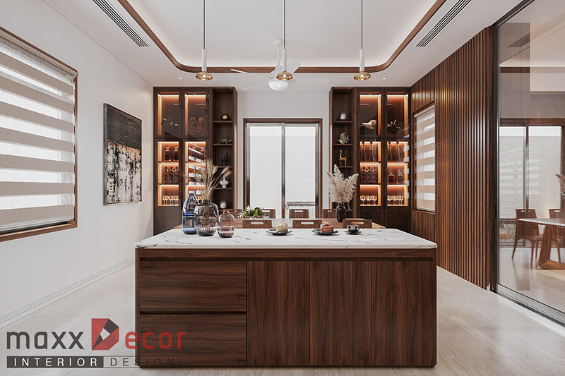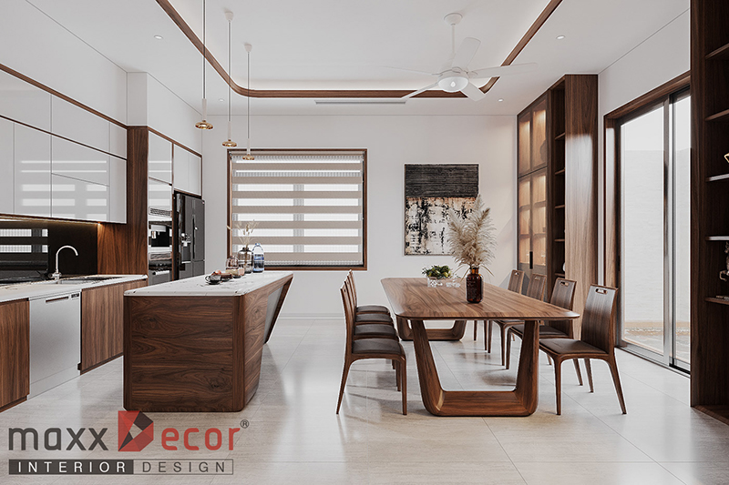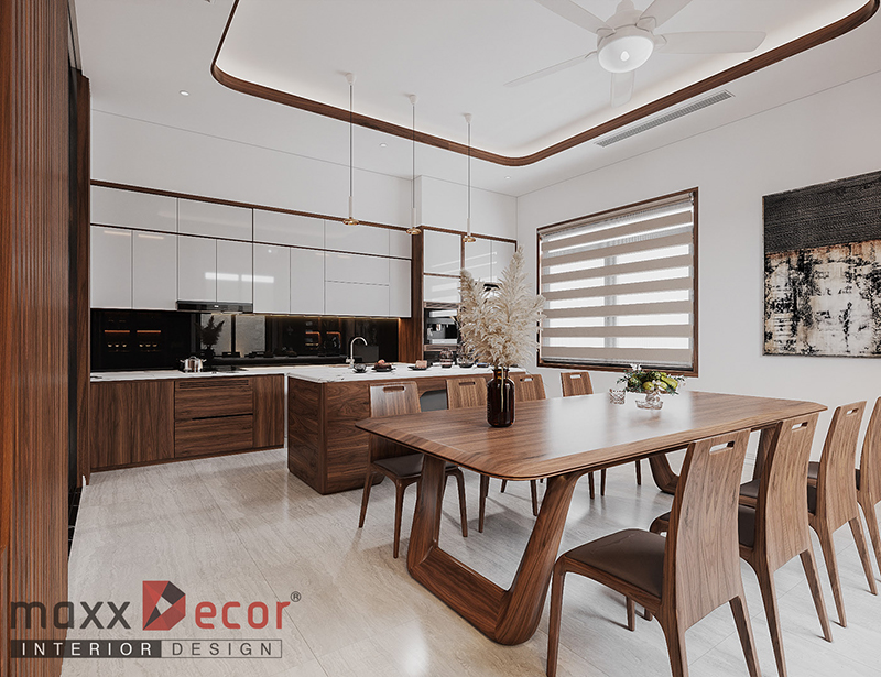 Đây là không gian có vị trí liền kề, tập trung chủ yếu vào các yếu tố không gian cuối tuần sinh hoạt chung của nhiều gia đình nên nội thất bếp được hướng đến những thiết kế mang lại cảm giác ấm cúng, sum họp với những chiếc bàn ăn chụp đèn giản dị. Bạn cũng có thể thiết kế ngay bàn ăn ở trong không gian bếp để tiết kiệm diện tích và chi phí cho ngôi nhà.