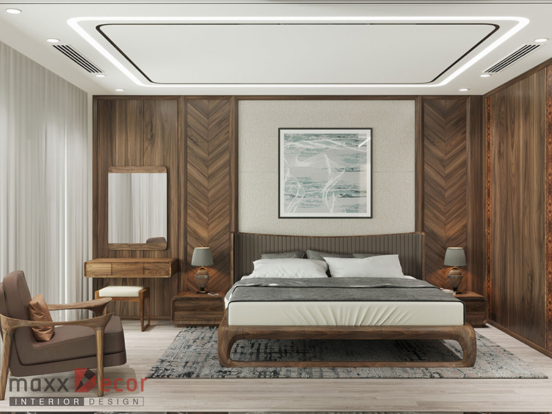 Phòng ngủ master gỗ óc chó với vân gỗ đẹp đến từng chi tiết