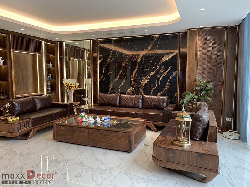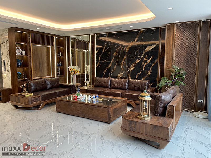 Tổng thể, phòng khách gỗ óc chó trong biệt thự sẽ làm nổi bật vẻ đẹp tự nhiên của gỗ và tạo ra không gian sang trọng, ấm cúng và đáng mơ ước.