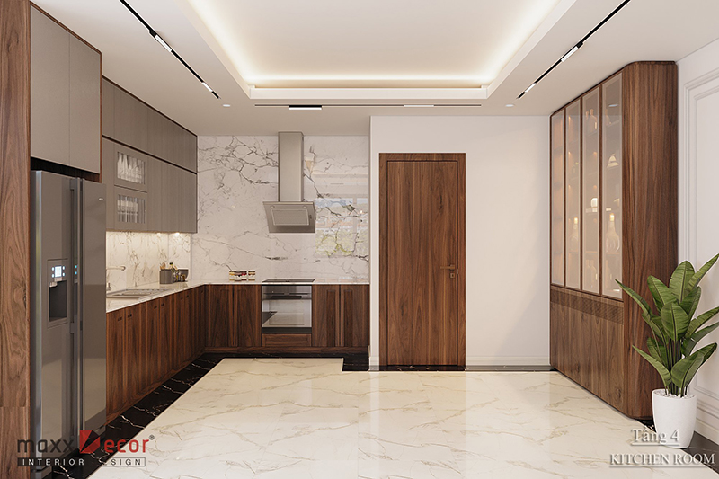 Thiết kế nội thất phòng khách bếp gỗ óc chó biệt thự hiện đại