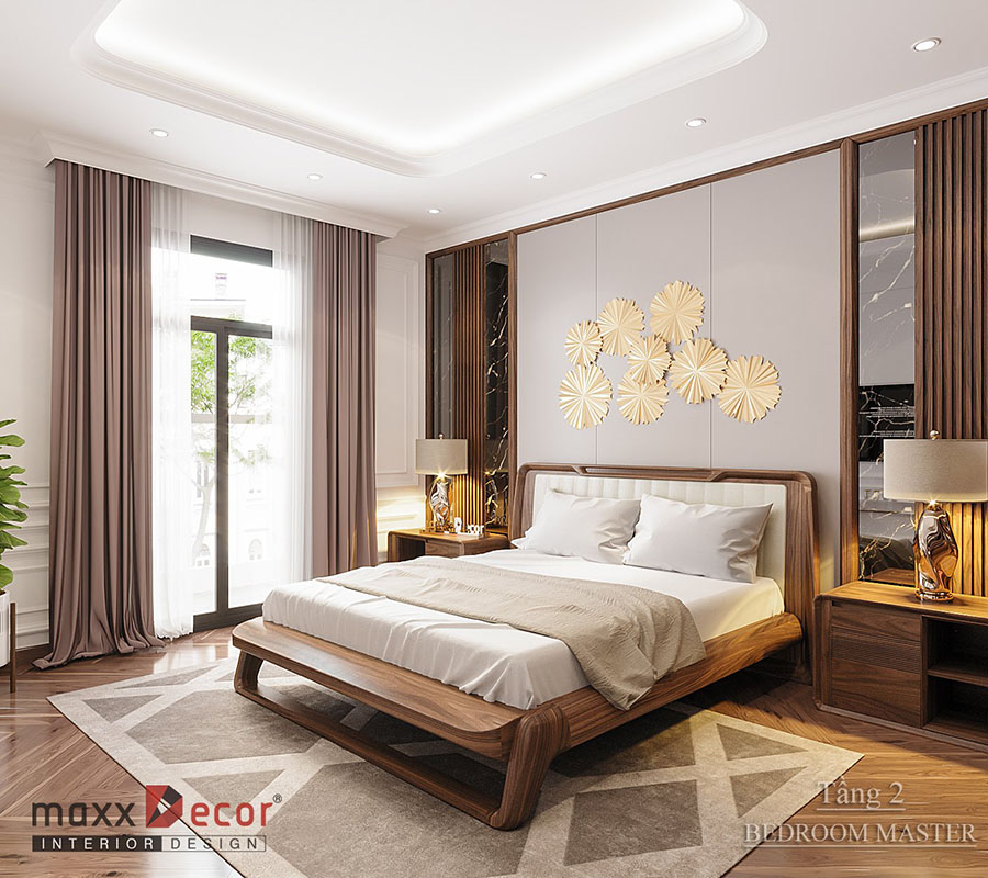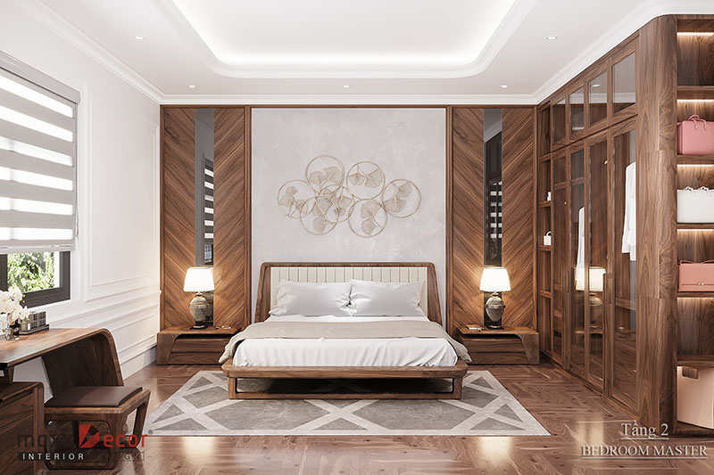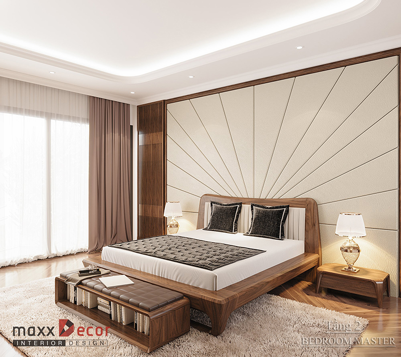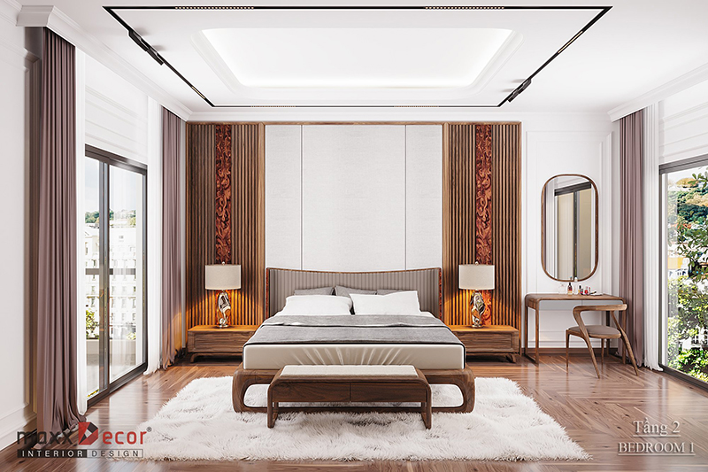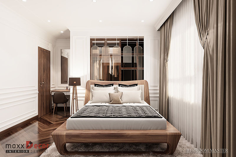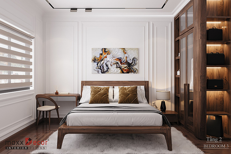 Sự sang trọng và tiện nghi là những gì chúng ta cảm nhận được khi nhìn vào mẫu thiết kế này. Với hai cửa sổ hai bên giúp căn phòng ngủ thông thoáng, dễ chịu. Màu trắng của sơn tường và trần nhà kết hợp với những đồ nội thất làm bằng gỗ óc chó hết sức tuyệt vời và ấn tượng. Mọi chi tiết nội thất đều được bài trí tinh tế, khoa học, đem lại cho căn phòng giá trị thẩm mỹ cao.