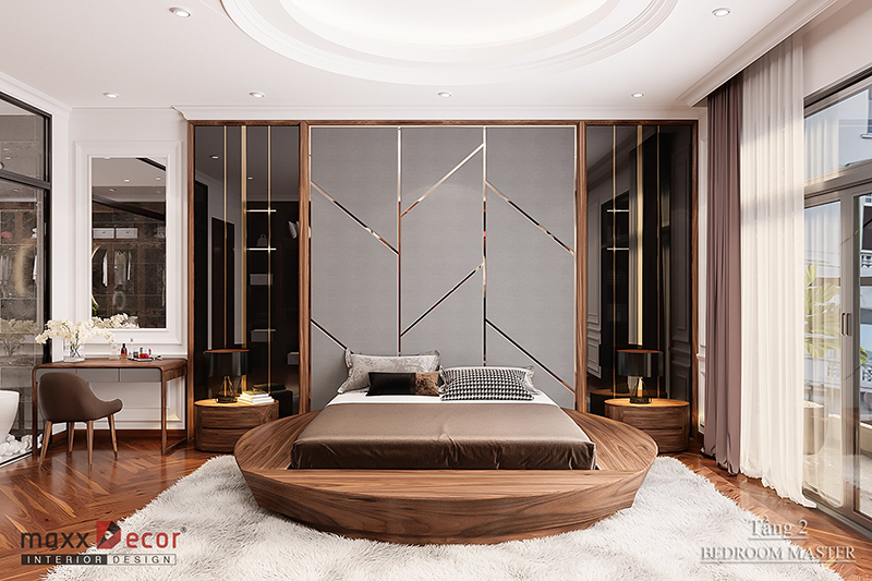 Ở trung tâm của căn phòng ngủ là một chiếc giường làm bằng gỗ óc chó vô cùng đẹp. Thật tuyệt vời với những ai được nằm trên chiếc giường tuyệt vời này. Màu sắc của mẫu thiết kế này vô cùng hài hòa và trang nhã. Mọi thứ dường như đã đạt đến độ hoàn mỹ, khó có từ ngữ nào có thể diễn tả được vẻ đẹp của mẫu thiết kế này.