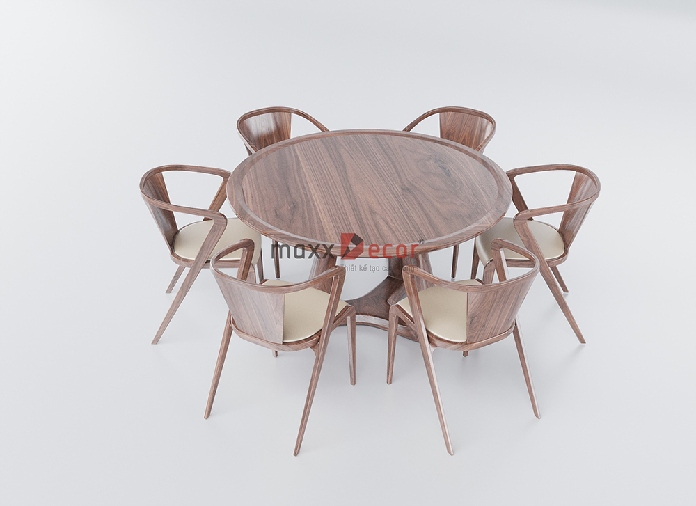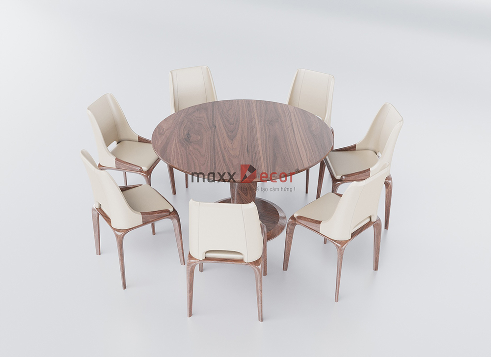 Bàn ăn gỗ óc chó hình tròn: Thiết kế hình tròn với chân gỗ chắc chắn, mang đến cảm giác ấm cúng và gần gũi.